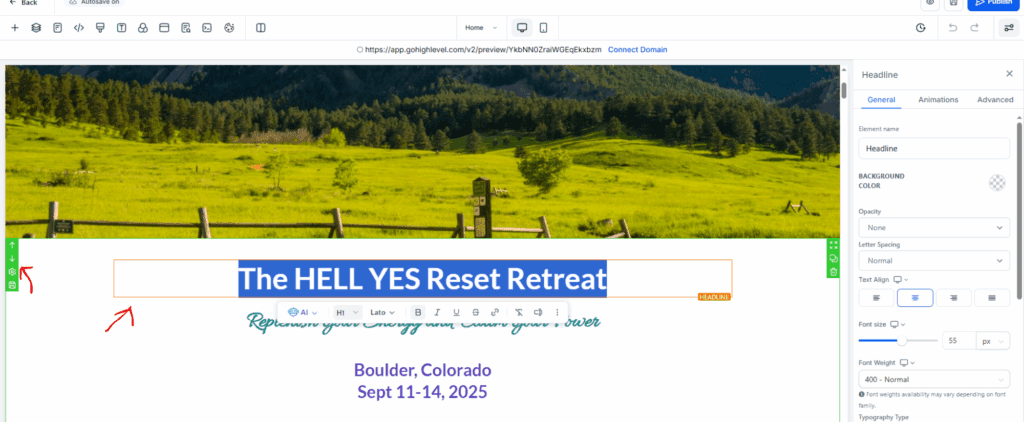 When trying to make typography edits, the main way you can do so is by clicking on the section of text that you want to edit, these sections of text have an editor to the right that affects text size, color, and boldness across the entire section of text. If you want to make one specific part of the text bold, highlight the part that you want bold and the window you see under the highlighted title will appear(you can highlight by double click a single word or “click dragging” over a section of the text.) Picking any of the options will affect whatever you have highlighted. You can add links, make the text bold, italic or underlined from here.